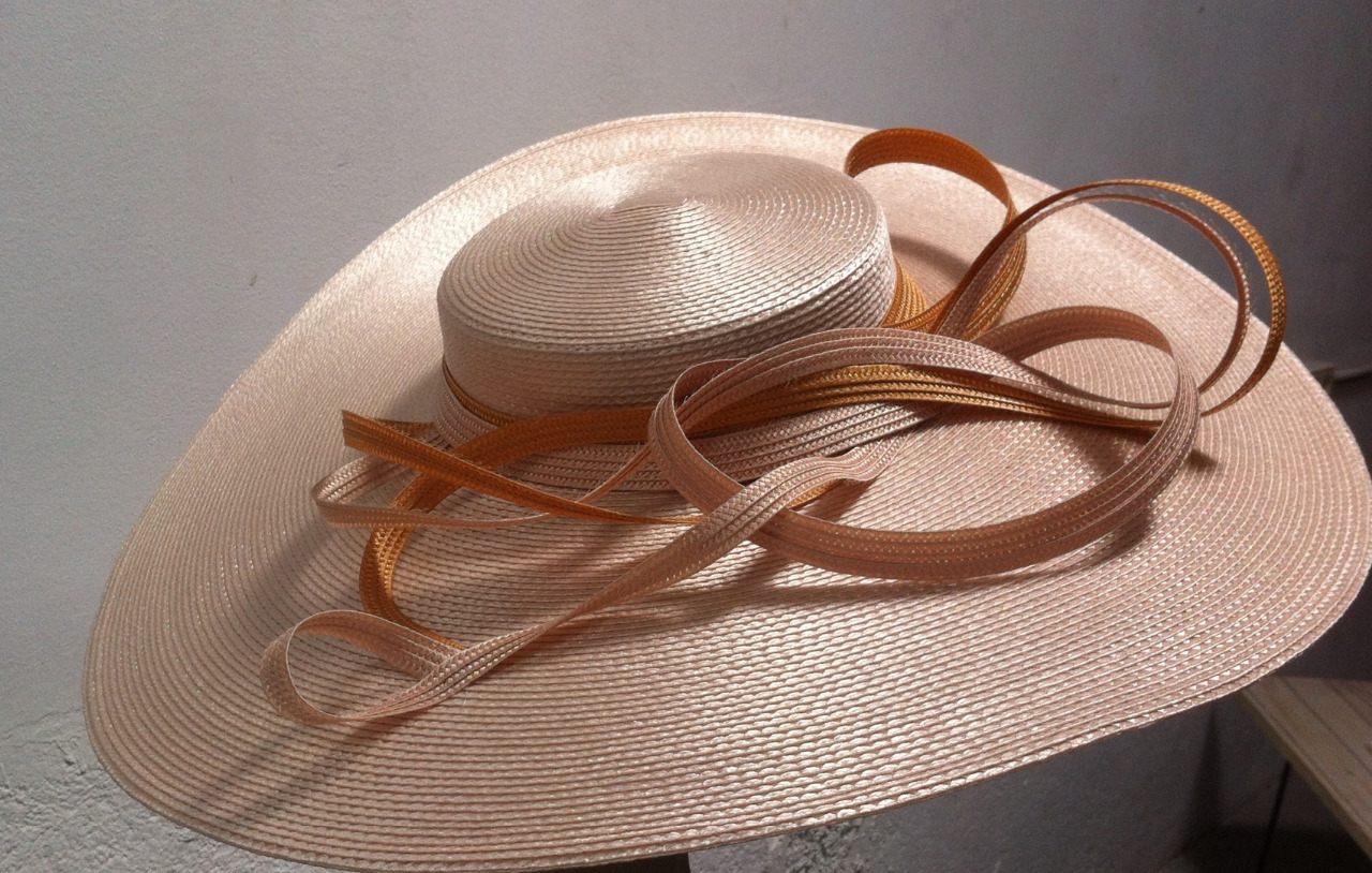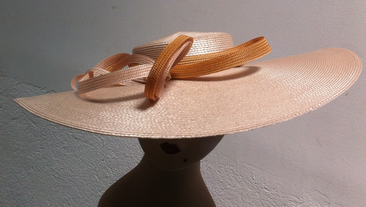 Pamela XXL con lazada en el mismo material combinada con dorado. Se sujeta con diadema forrada en tela.